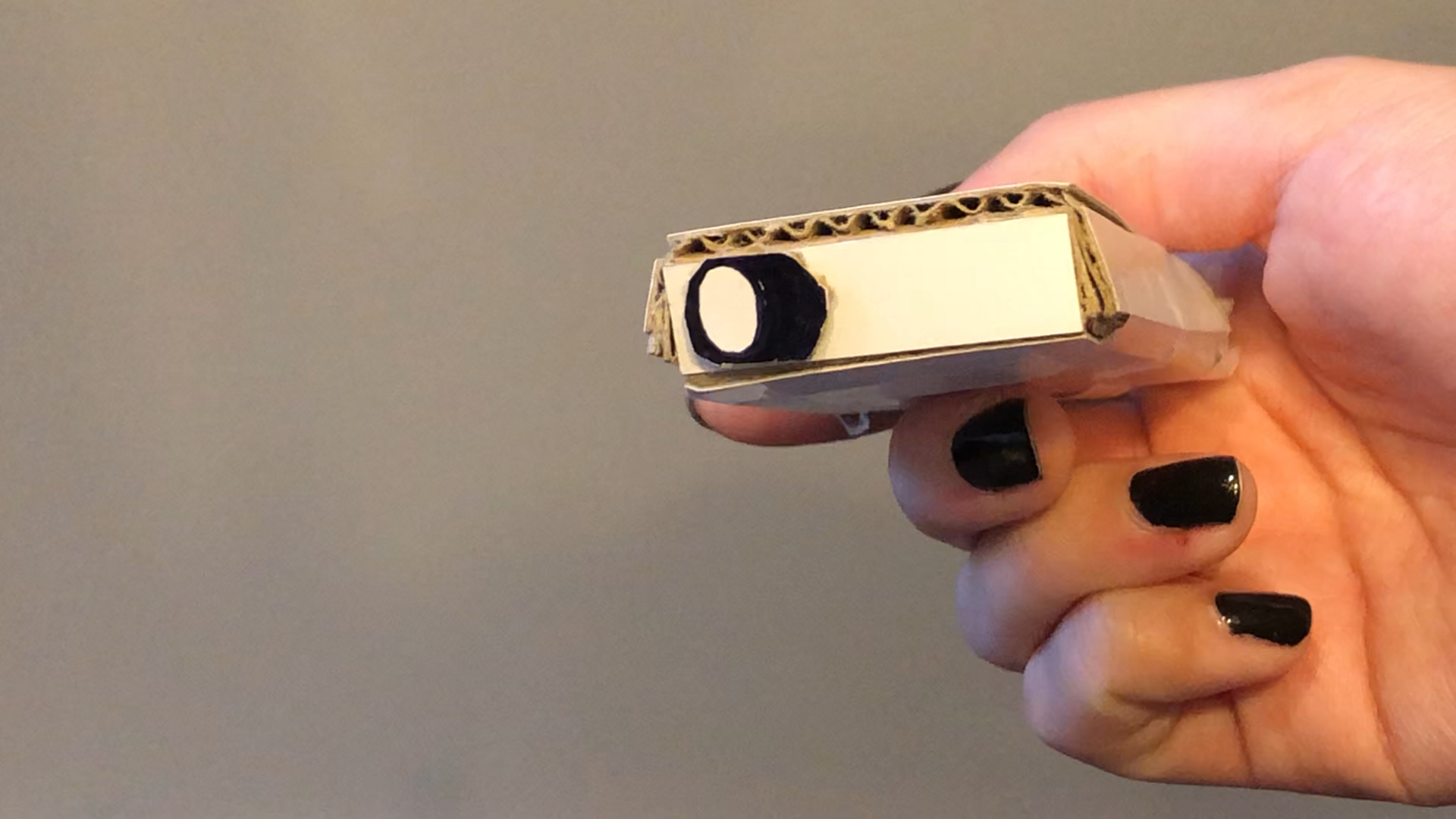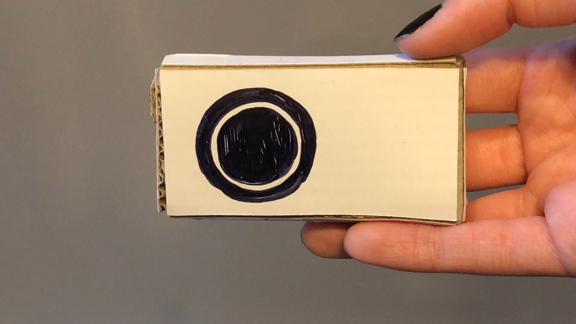 I quickly prototyped a small ‘camera’ using cardboard. I filled in the lens with a sharpie, and cut out a smaller circular shape to display a toggle button. This would reference whether or not the camera was on or off.
